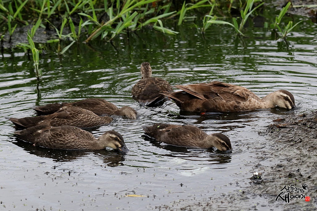 먹이활동하는 방법을 열심히 배우고 있는 청년 흰빰검둥오리들 ...