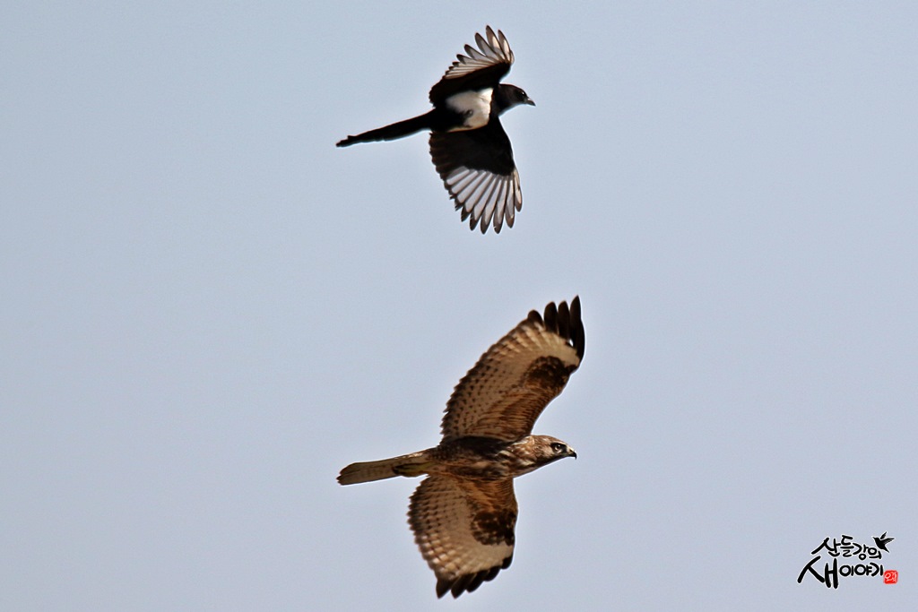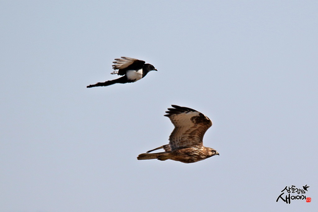 2019. 10. 26. 주남저수지에서 말똥가리를 괴롭히는 까치를 만났습니다. 언제나 위태로운 모습입니다.