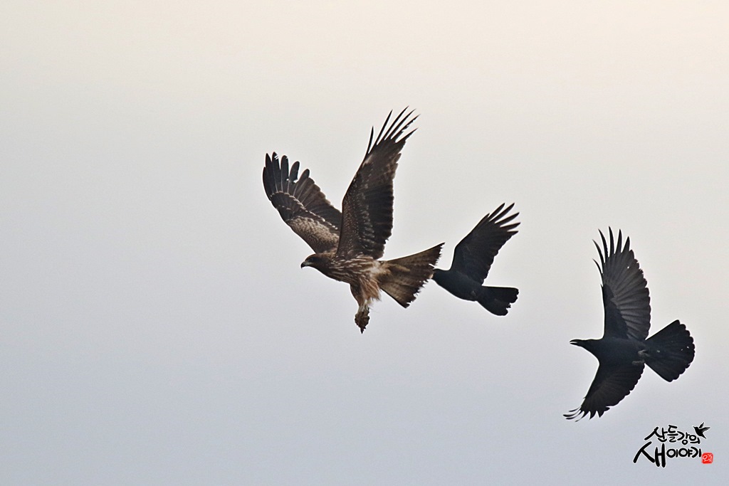 먹이를 낚아챈 솔개를 추격하는 까마귀들 ...