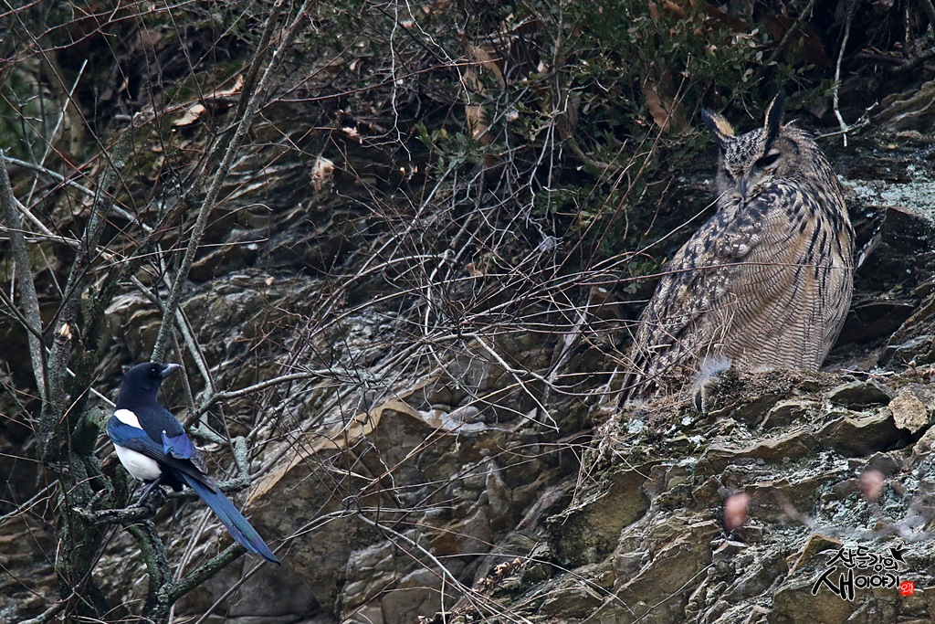 묘한 긴장감이 흐르고 ... 조폭 까치를 무시하는 수리부엉이