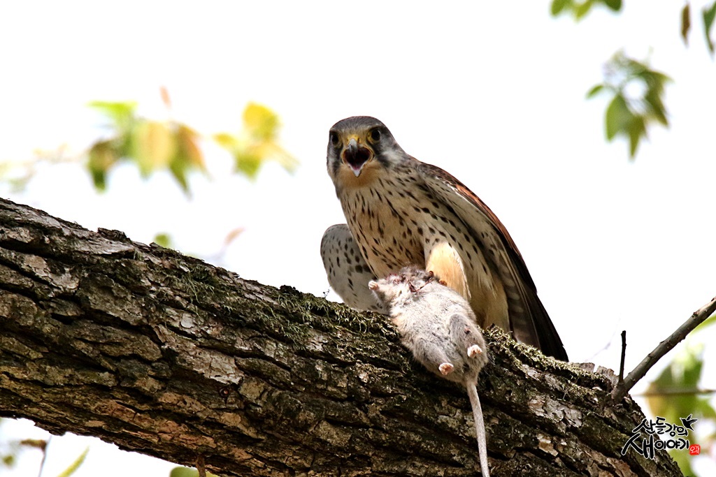 그리고 약 5분후 쥐를 잡아 도착한 황조롱이 수컷이 암컷을 부릅니다.