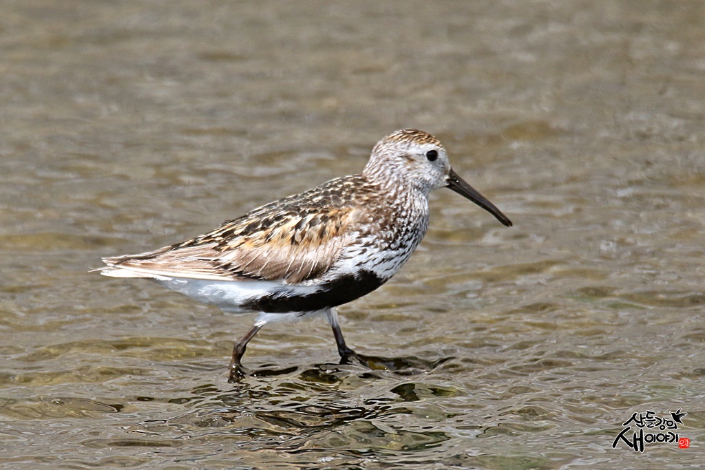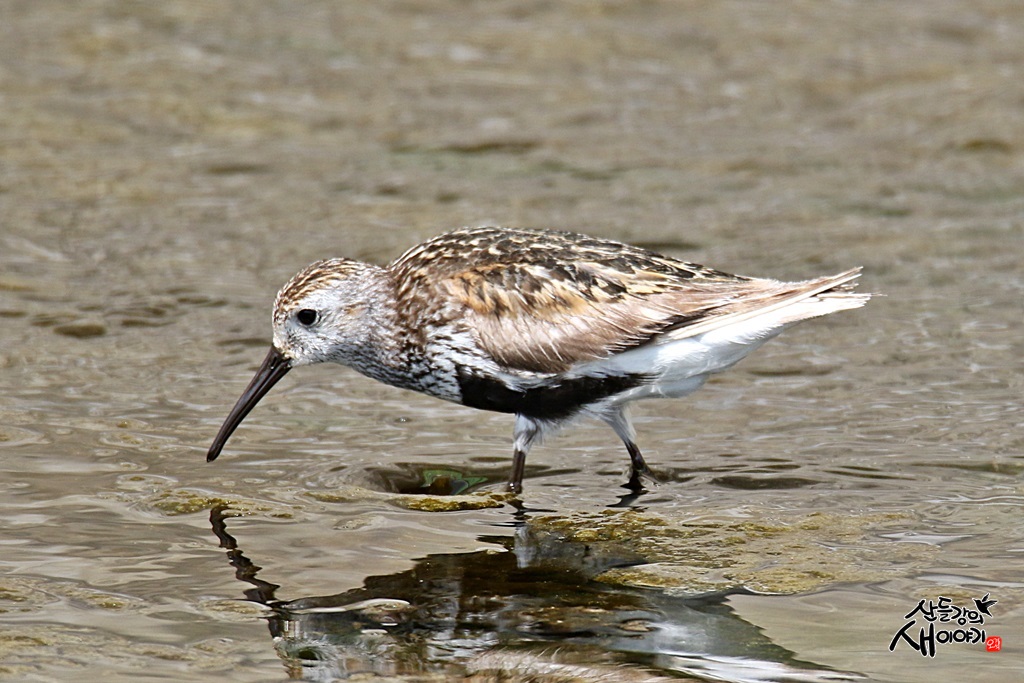 부리는 길고 아래로 약간 휘어져 있으며, 여름깃으로 배에 검은색의 큰 반점이 있습니다.(사진 참조)