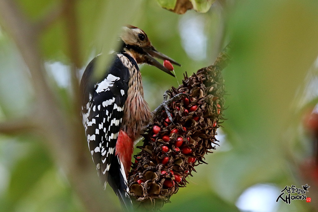 2020.10.2. 추석연휴기간 중 대구수목원에서 만난 큰오색딱다구리로 일본목련나무의 빨간 열매를 먹고 있습니다.
