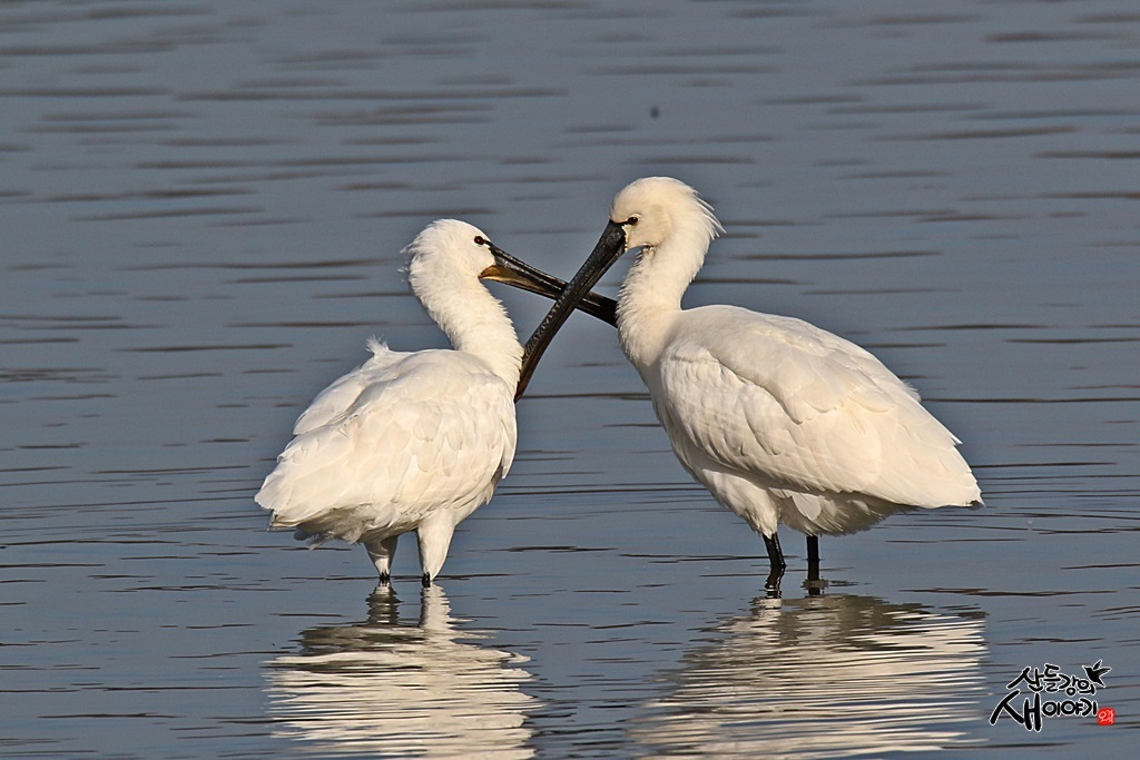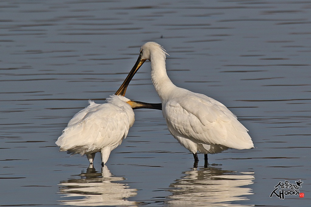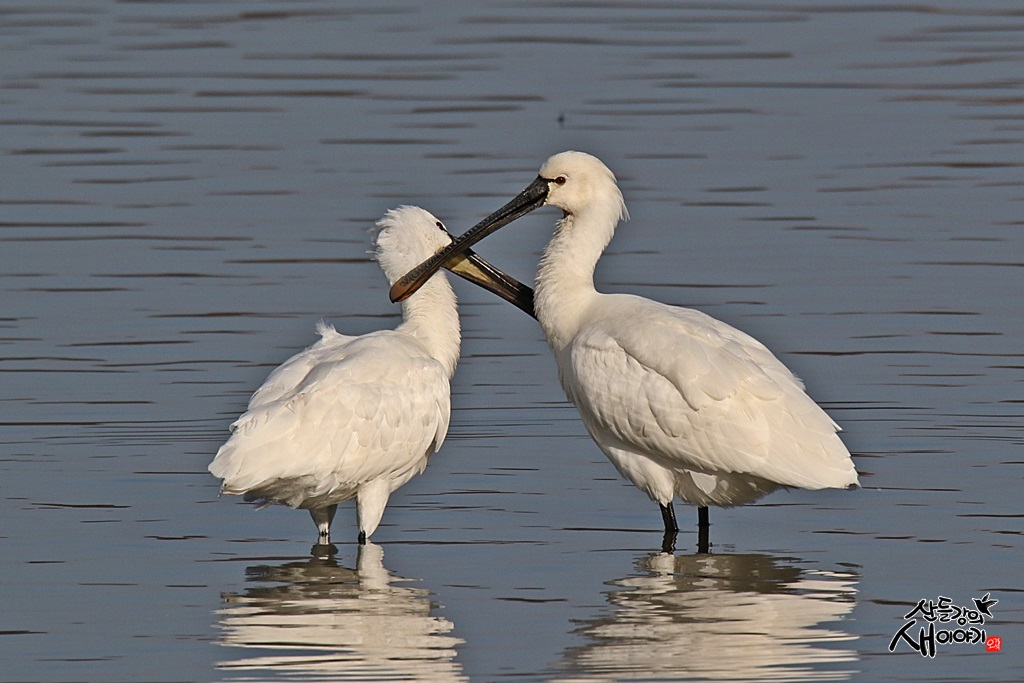2020.11.28. 경남 창녕군에 있는 우포늪에서 만난 노랑부리저어새로 2마리가 다정하게 깃털을 정리해줍니다.