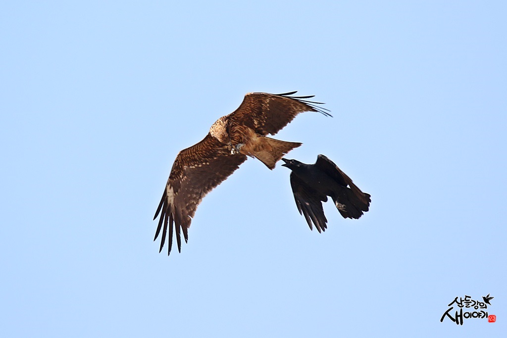 솔개를 괴롭히는 까마귀... 솔개가 날자 까마귀떼가 따라 붙습니다. 그리고는 민첩한 움직임으로 꼬리깃을 탐냅니다