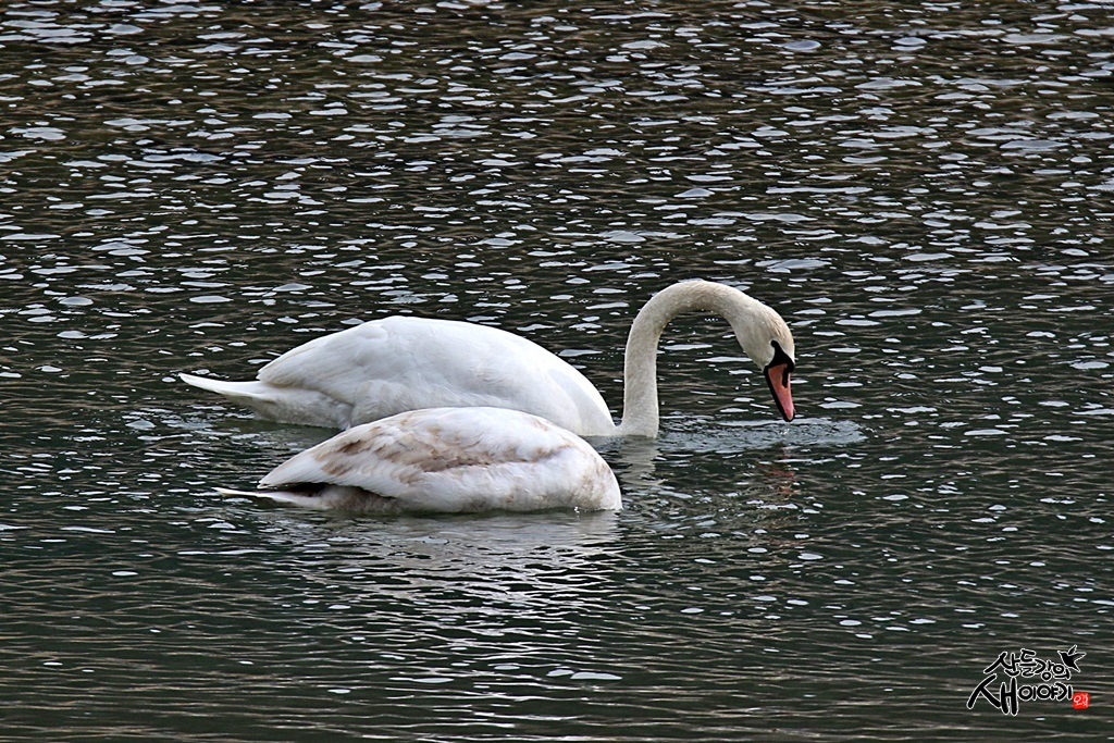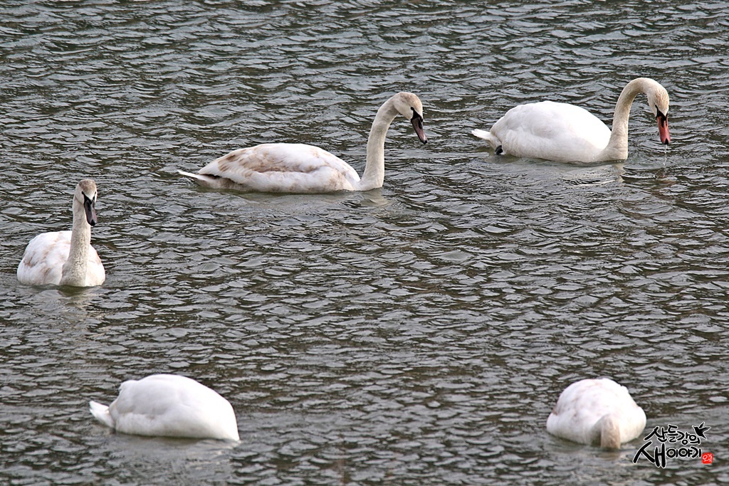 2021.2.1. 동해안 탐조여행 중 작은 하천에서 먹이활동을 하던 혹고니 가족입니다. 성조 2마리, 유조 3마리입니다.