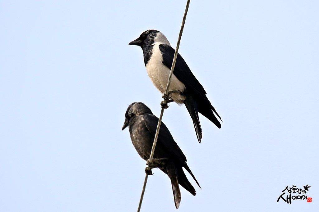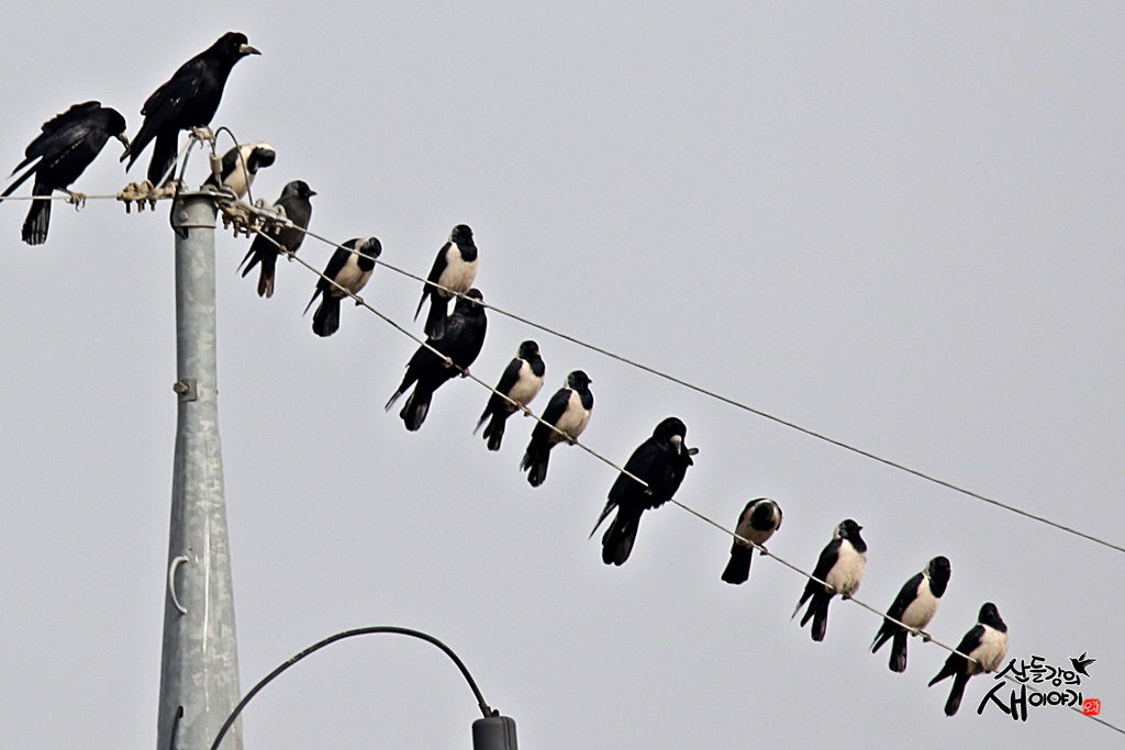 떼까마귀 무리들과 함께 다니는 갈까마귀들... 참새목 까마귀과에 속하며, 크기가 33cm로 까마귀들 중 가장 작다.