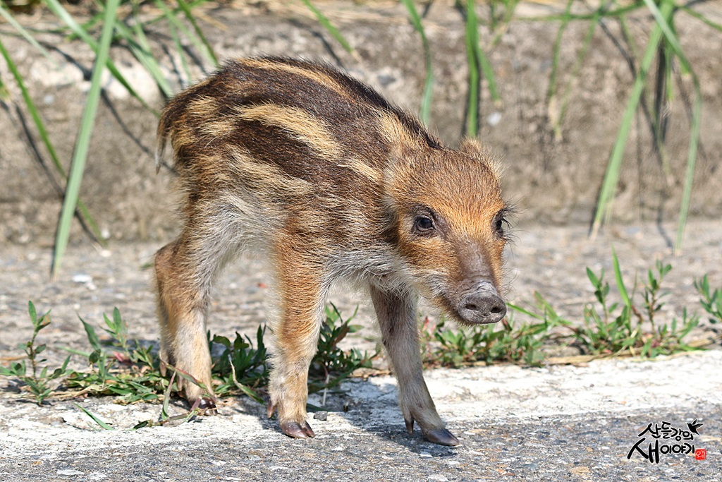 2021.7.2, 경북 성주지역의 산에서 지방도를 따라 내려오던 중 만난 멧돼지 새끼인데 혼자 돌아다니고 있네요.