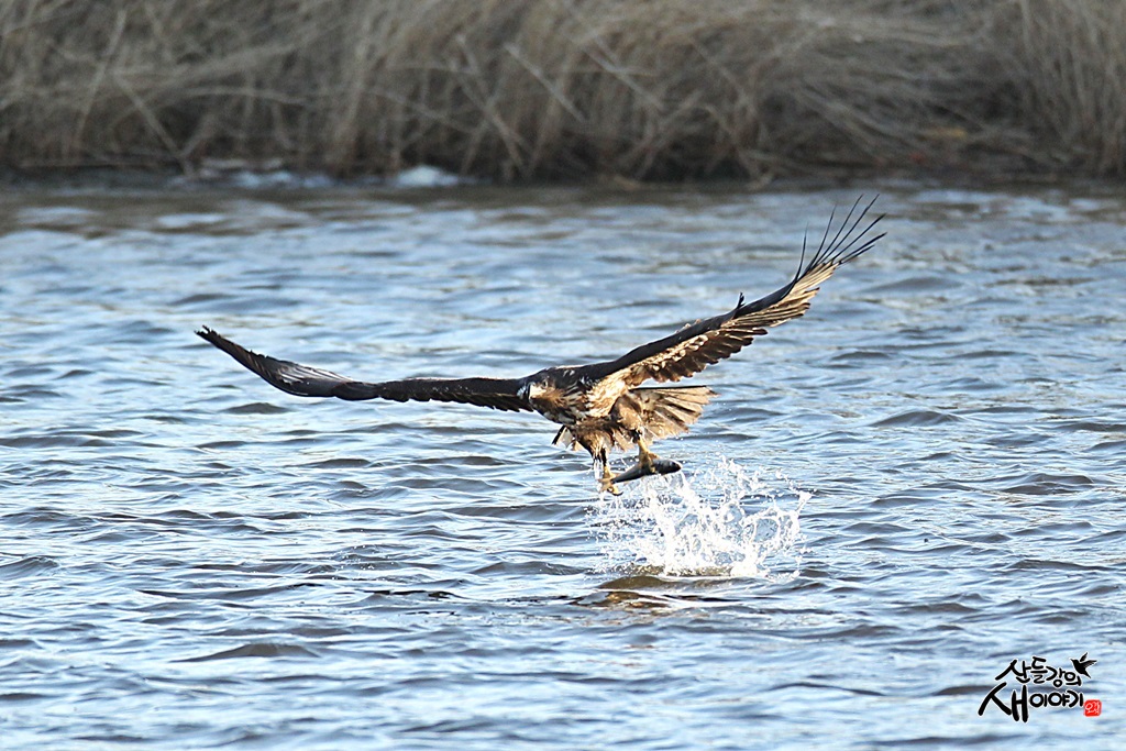 2022.3.5. 깅원도 강릉시 남대천 지역의 탐조여행에서 만난 맹금류 흰꼬리수리 어린새의 물고기 사냥장면입니다.