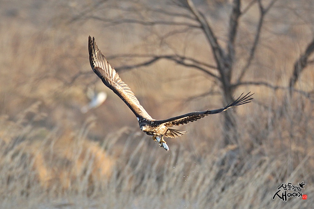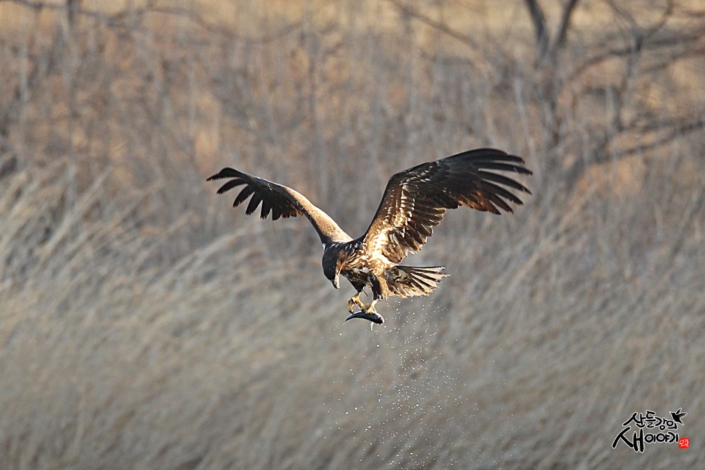 2022.3.5. 깅원도 강릉시 남대천 지역의 탐조여행에서 만난 맹금류 흰꼬리수리 어린새의 물고기 사냥장면입니다.