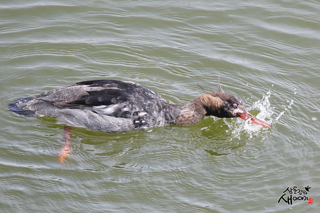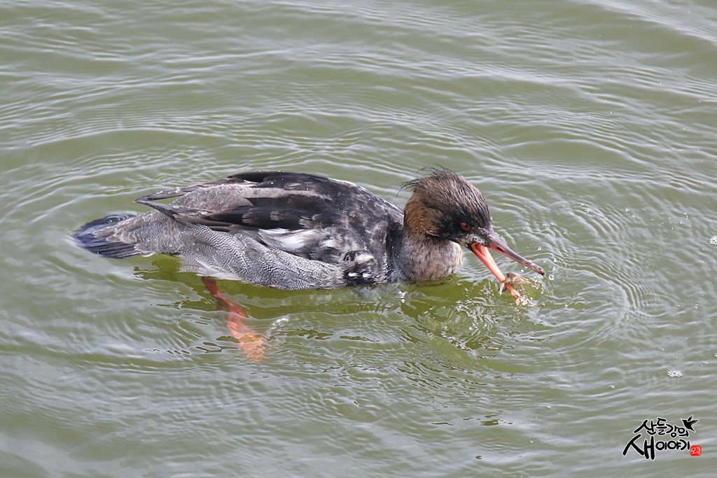 2022.3.20, 경기도 화성시 화성호를 탐조하던 중에 만난 바다비오리 암컷의 게 사냥장면입니다. 바닥에서 잡아올리네요.