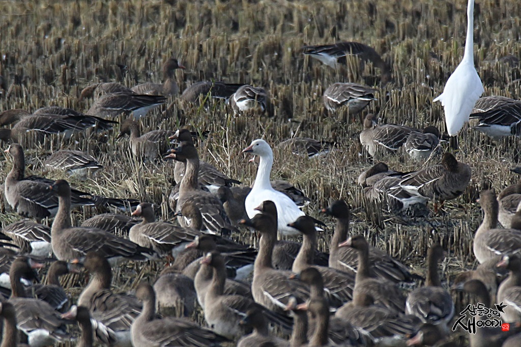 충청남도 서산시 천수만을 탐조하던 중 만난 흰기러기 한마리입니다. 큰기러기와 쇠기러기 무리 속에서 관찰되었습니다.