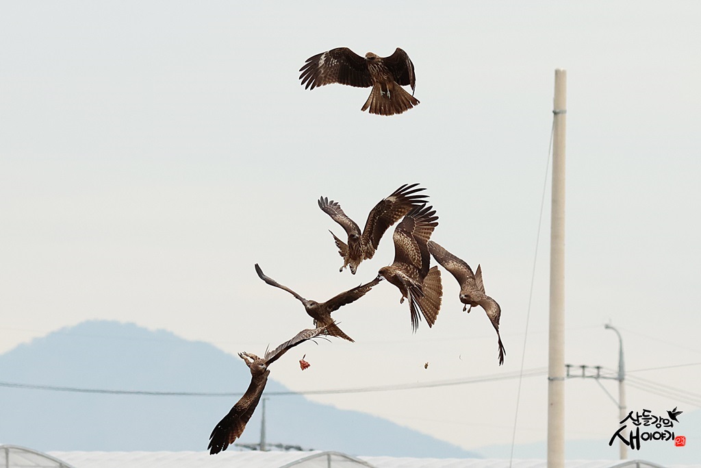 부산지역을 탐조하던 중 만난 맹금류인 솔개들을 만났습니다. 솔개 6마리가 먹이를 쟁탈하는 모습을 담았습니다.