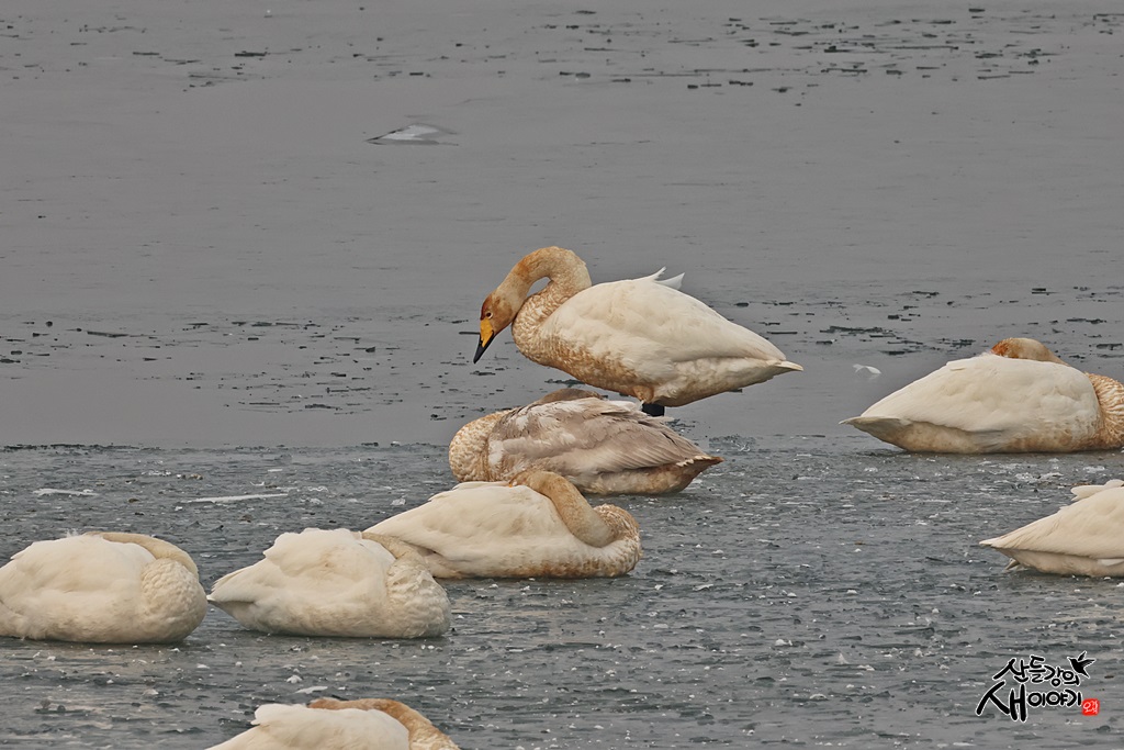 경상북도 구미시를 지나가는 낙동강에 나가보니 추위로 얼었네요. 얼음 위에서 쉬고 있는 큰고니들을 담았습니다.