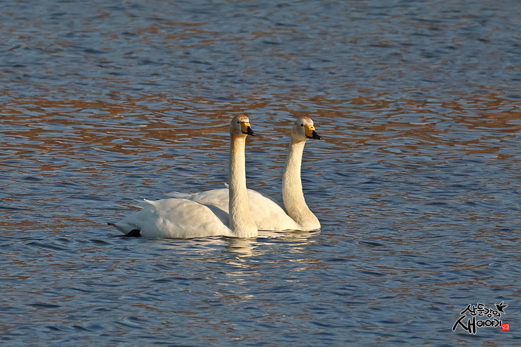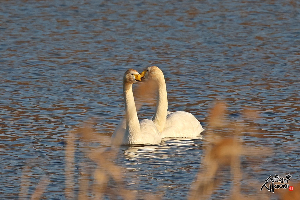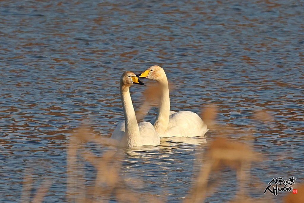강원도 강릉시를 지나가는 남대천을 탐조하던 중 만난 화목한 큰고니 부부입니다. 멸종위기종이자 천연기념물입니다.