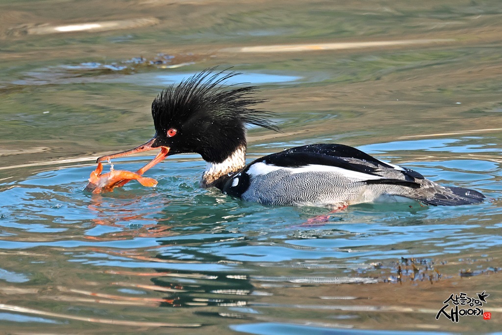 경상북도 포항시 호미곳면의 동해안 바닷가를 탐조하던 중 만난 화려한 바다비오리 수컷의 물고기 사냥장면입니다.