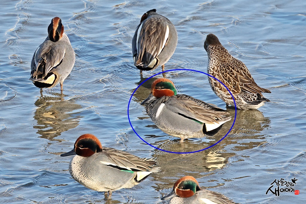 파란색 원에 있는 미국쇠오리와 주변의 쇠오리를 비교해 볼 수 있습니다.