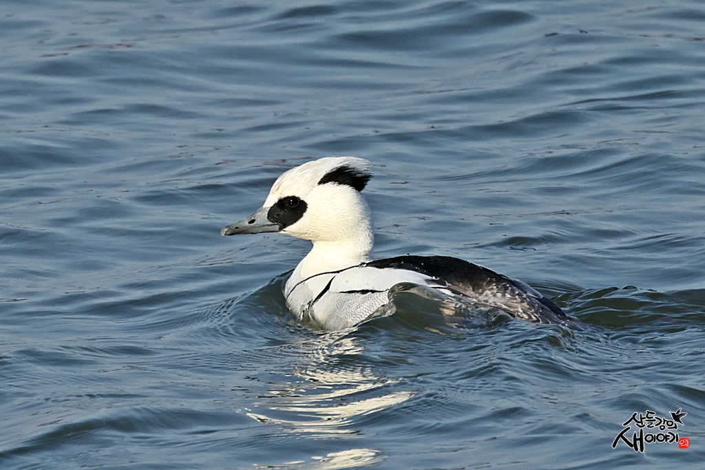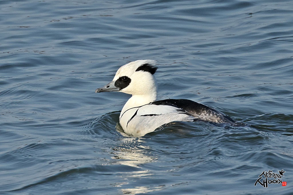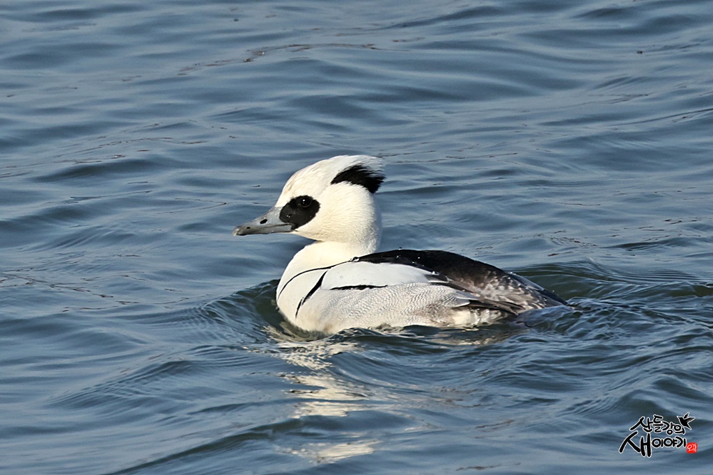 강원도 강릉시에 있는 경포호를 탐조하던 중 만난 흰비오리 수컷입니다. 팬더곰을 연상시키는 검은 반점이 특징입니다.
