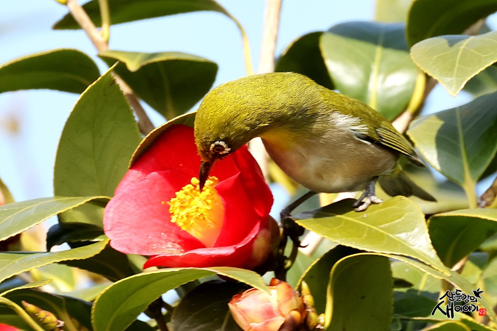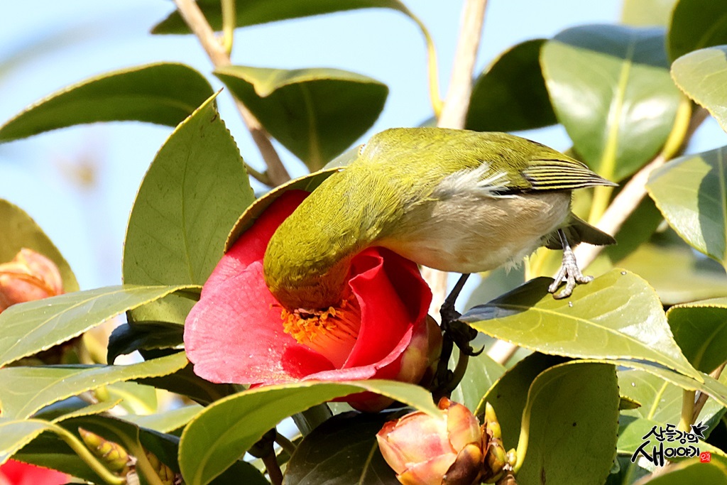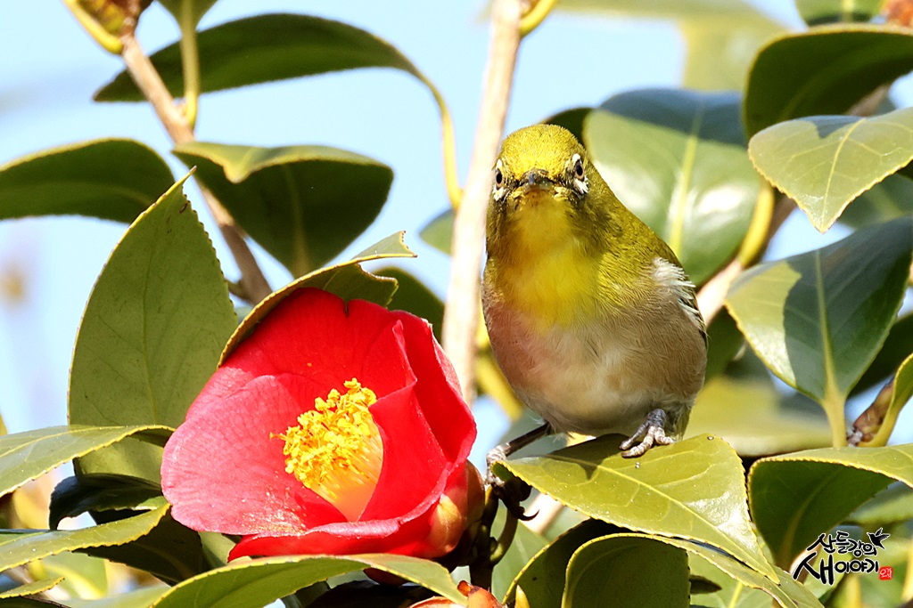 제주특별자치도 서귀포시 남원읍의 도로 가에 피어있는 동백나무의 동백꽃에서 꿀을 먹는 동박새를 만났습니다.