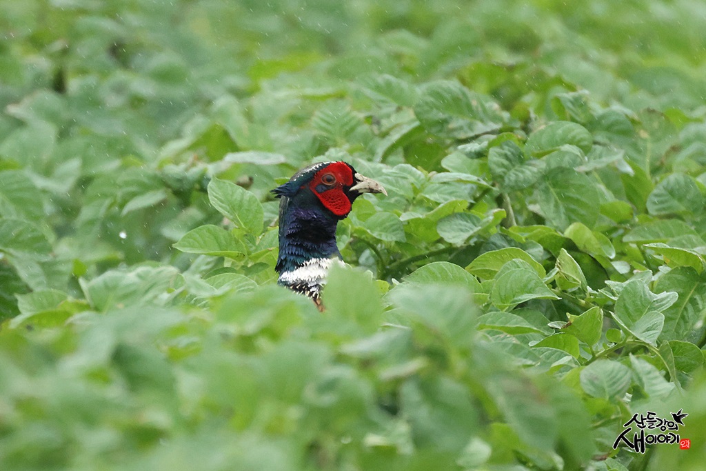 비 내리는 와중에 먹이활동하는 장끼(위쪽), 감자에 숨어있는 장끼(아래쪽)