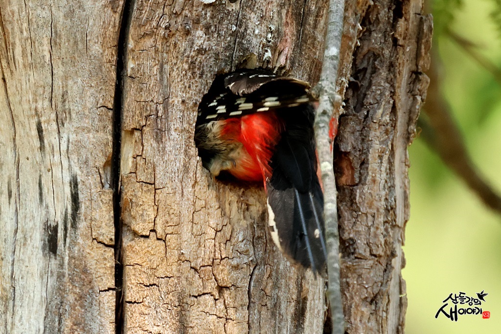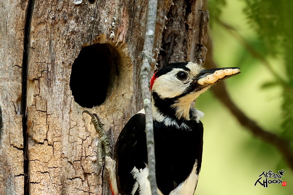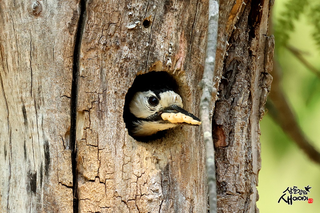 아빠 오색딱다구리가 먹이인 벌레를 가득 잡아 오네요.