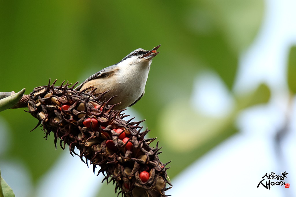 대구광역시 달서구 대곡동에 있는 대구수목원을 탐조하던 중 만난 동고비입니다. 일본목련의 빨간 열매를 먹고 있네요