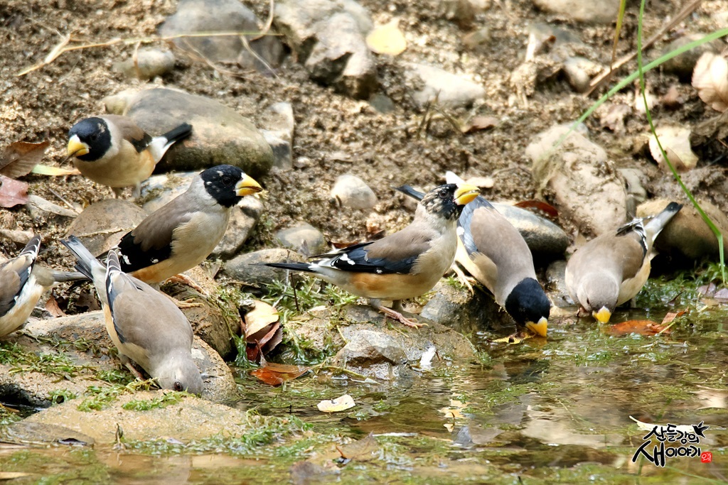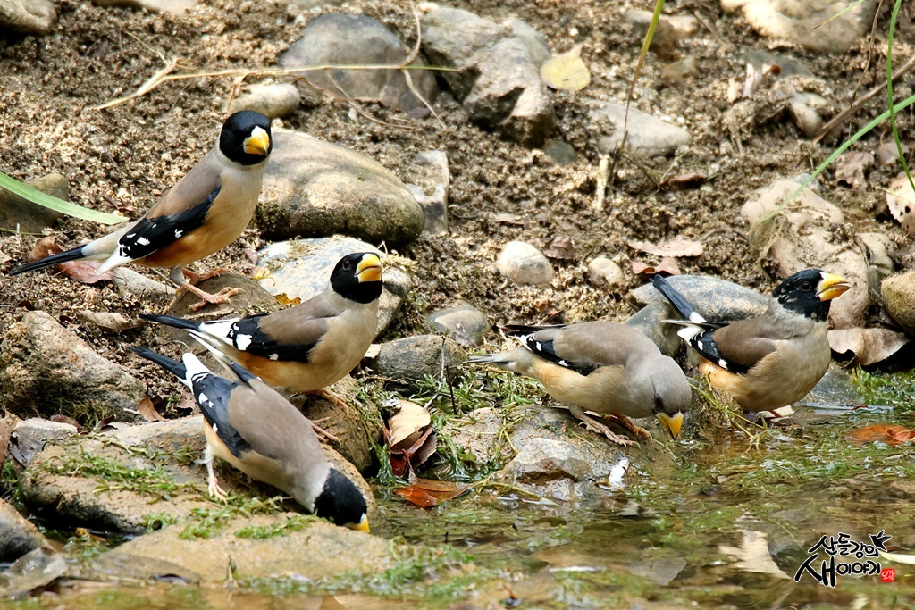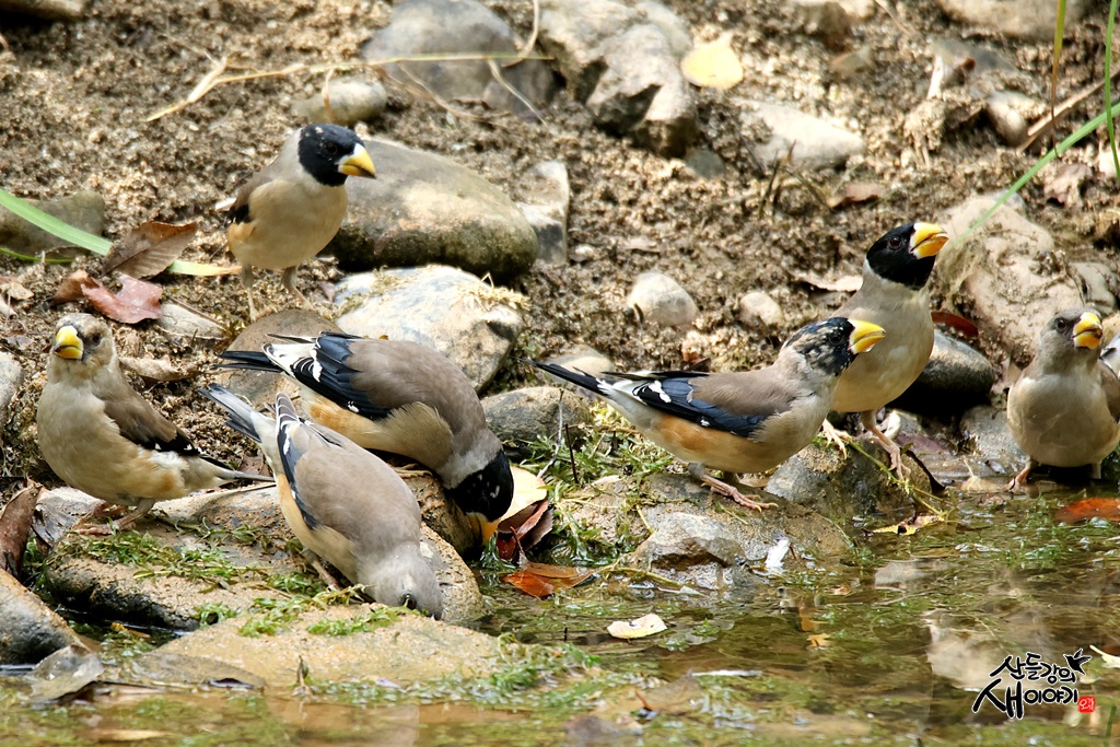 대구 광역시 달서구 대곡동에 있는 대구수목원을 탐조하던 중 만난 밀화부리들입니다. 물가에서 물을 먹고 있네요.