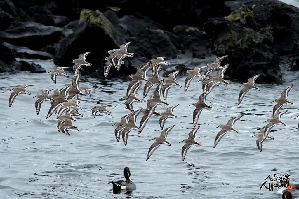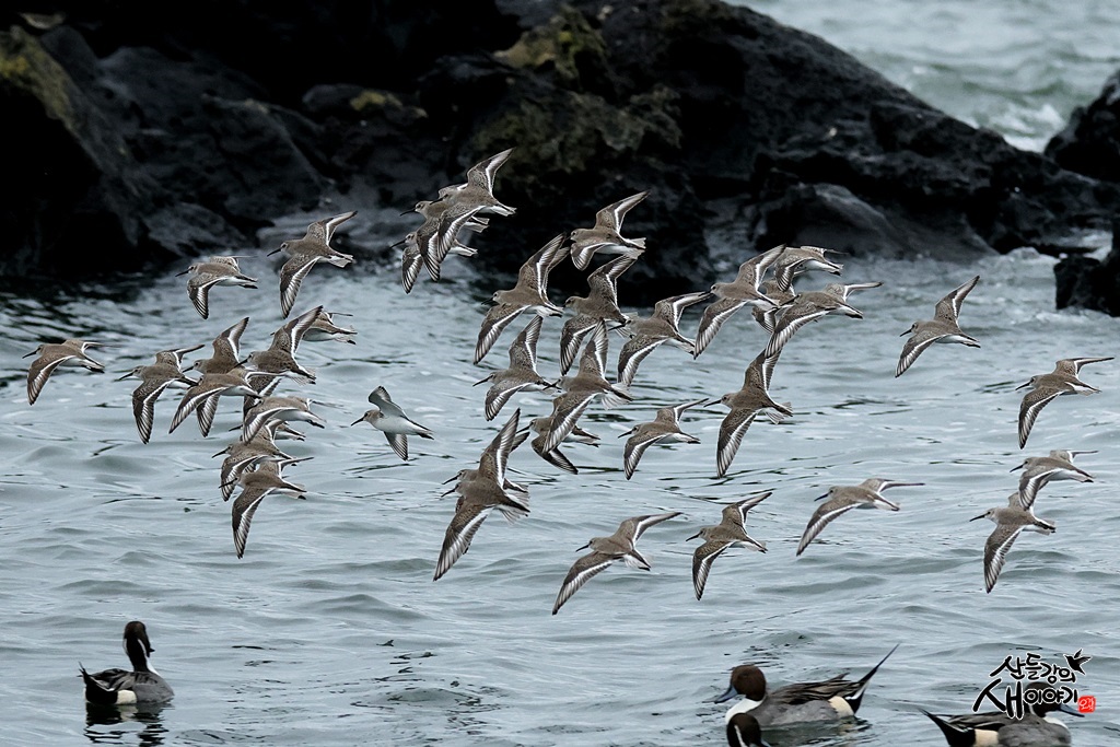 제주특별자치도 제주시에 있는 해안가를 탐조하던 중 만난 민물도요 군무입니다. 관찰된 개체수는 100여마리입니다.
