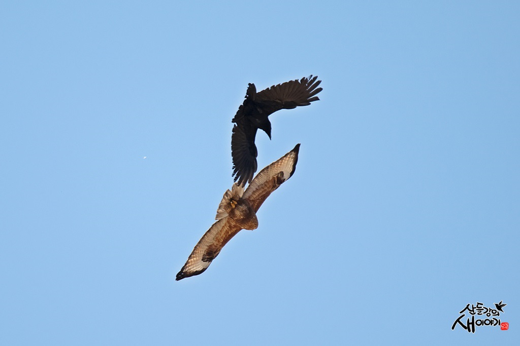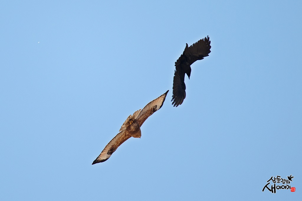 경상북도 고령군을 지나가는 회천을 탐조하던 중 만난 말똥가리입니다. 독수리식당에서 까마귀가 엄청 괴롭히네요.