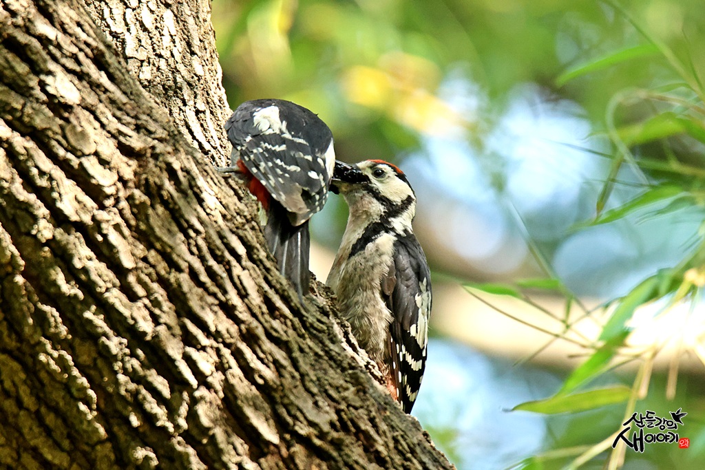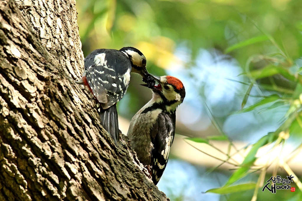 둥지에서 이소한 후 데리고 다니면서 뽕나무 열매(오디)를 먹이는 육추장면을 보여주고 있네요.
