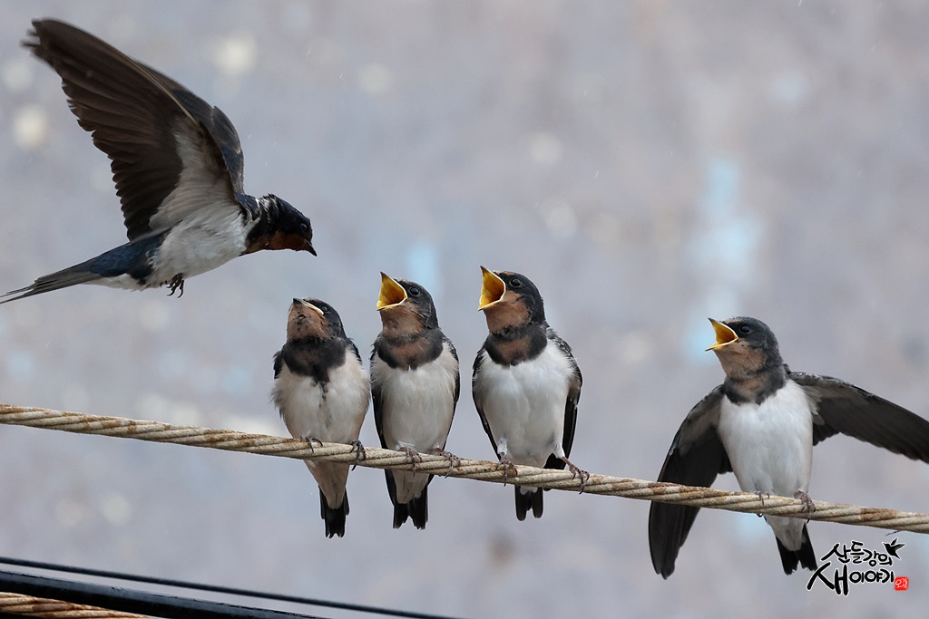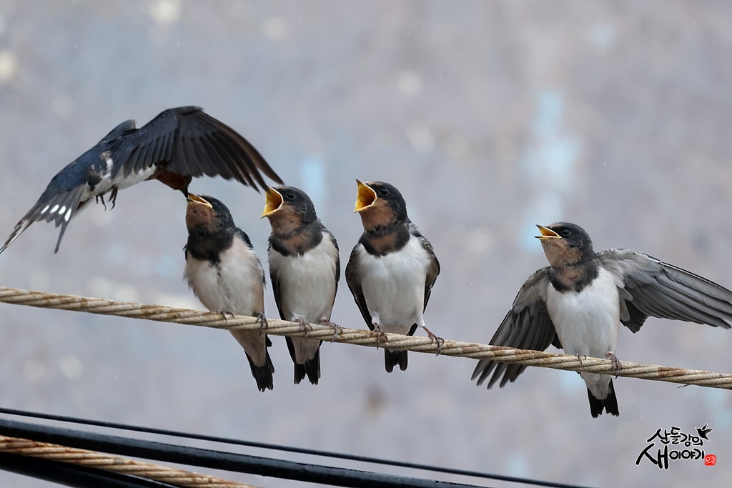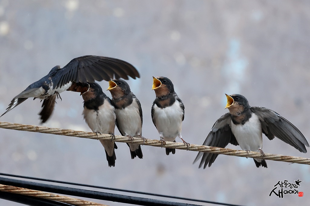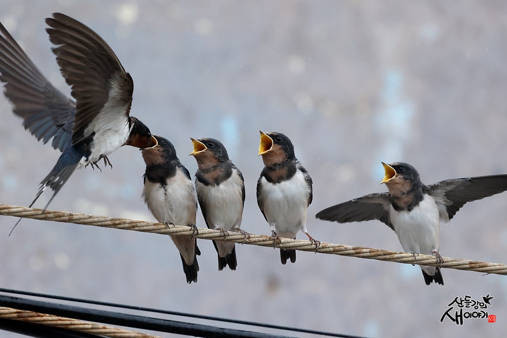제주특별자치도 서귀포시에 있는 노을해안로를 탐조하던 중 만난 제비 성조가 유조 이소한 후 육추하는 모습입니다.
