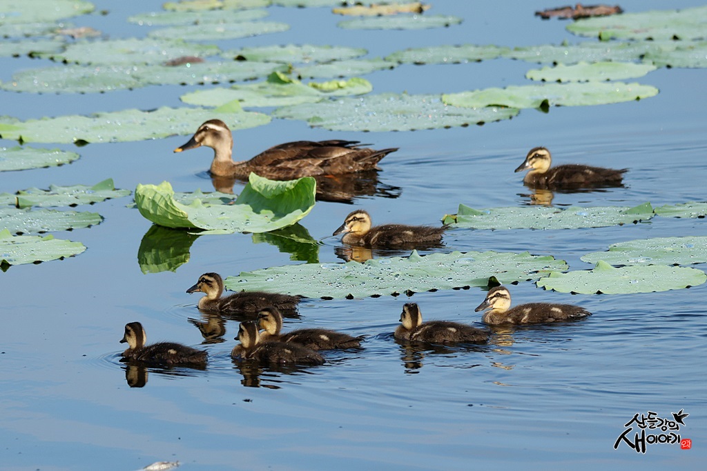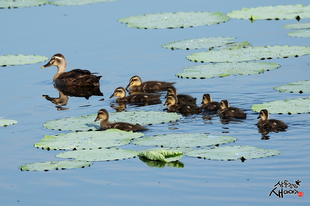 경상북도 경산시에 있는 저수지를 탐조하던 중 만난 흰빰검둥오리 엄마와 유조 8마리의 육추모습입니다.