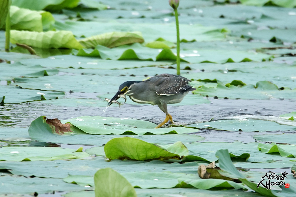 경상북도 경산시에 있는 저수지를 탐조하던 중 만난 검은댕기해오라기입니다. 물고기를 1타2피로 사냥하네요.