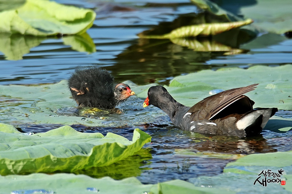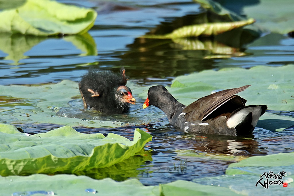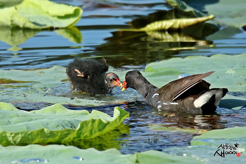 경상북도 경산시에 있는 작은저수지 연밭을 탐조하던 중 만난 쇠물닭 유조, 이소 후 육추하는 모습입니다.