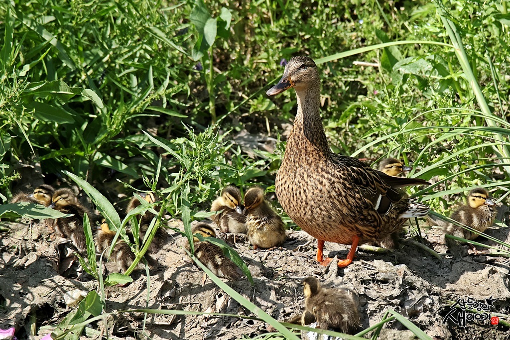 대구광역시 달성군에 있는 도심하천 진천천을 탐조하던 중 만난 청동오리 엄마와 아가들 10마리입니다.