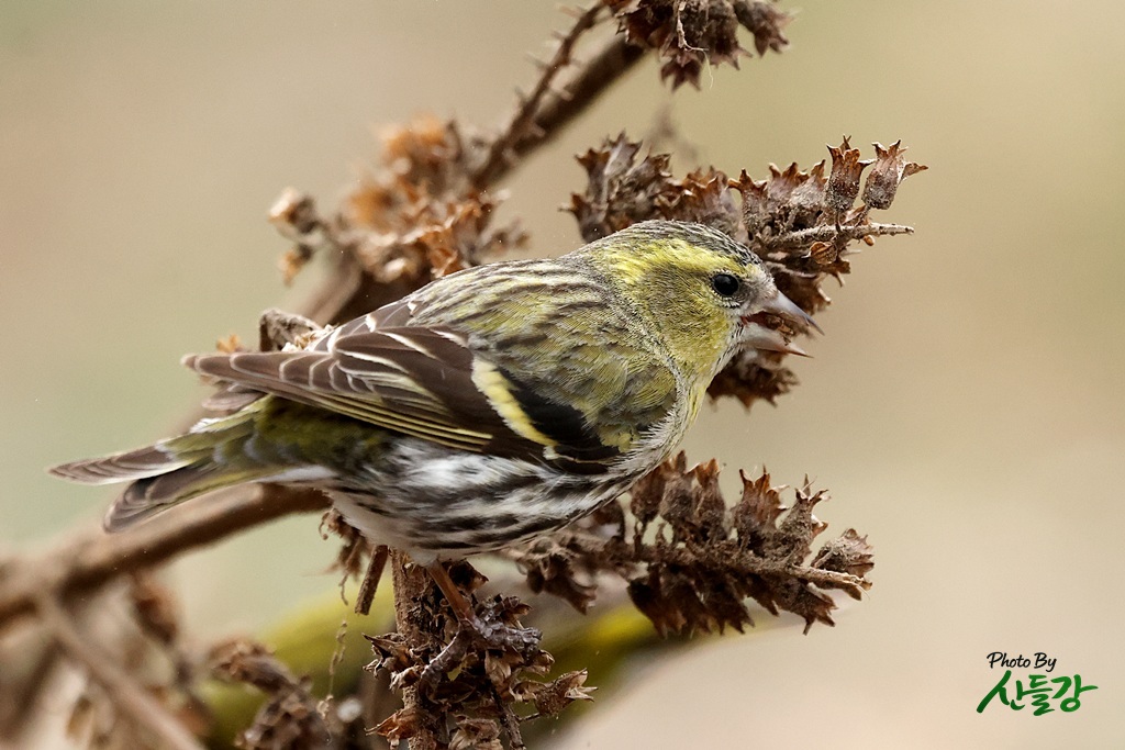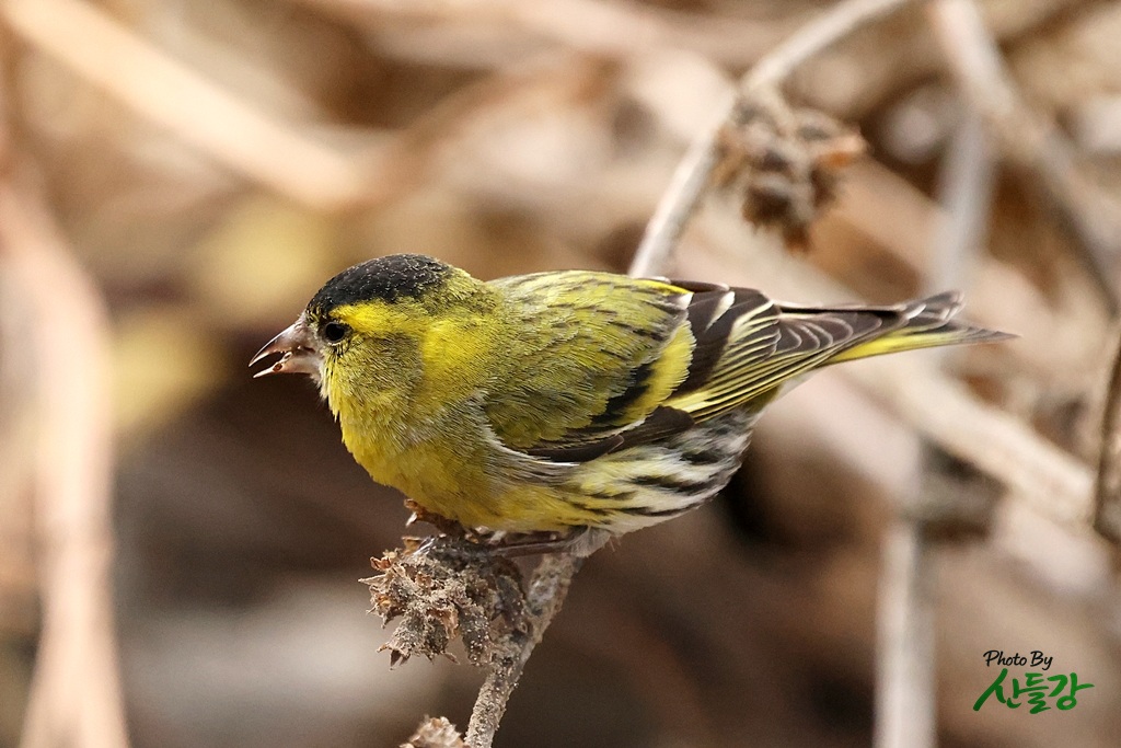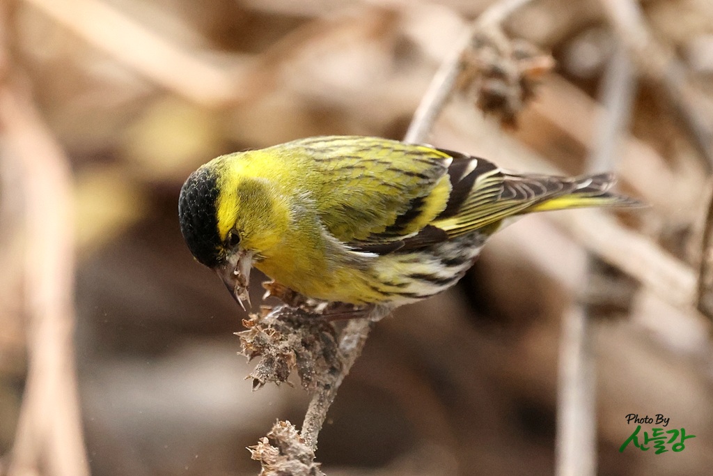 경상북도 성주군에 있는 자경하는 농원에서 작업하던 중 들깨를 먹는 검은머리방울새를 관찰했습니다.