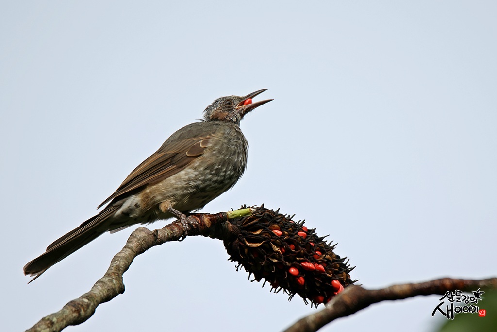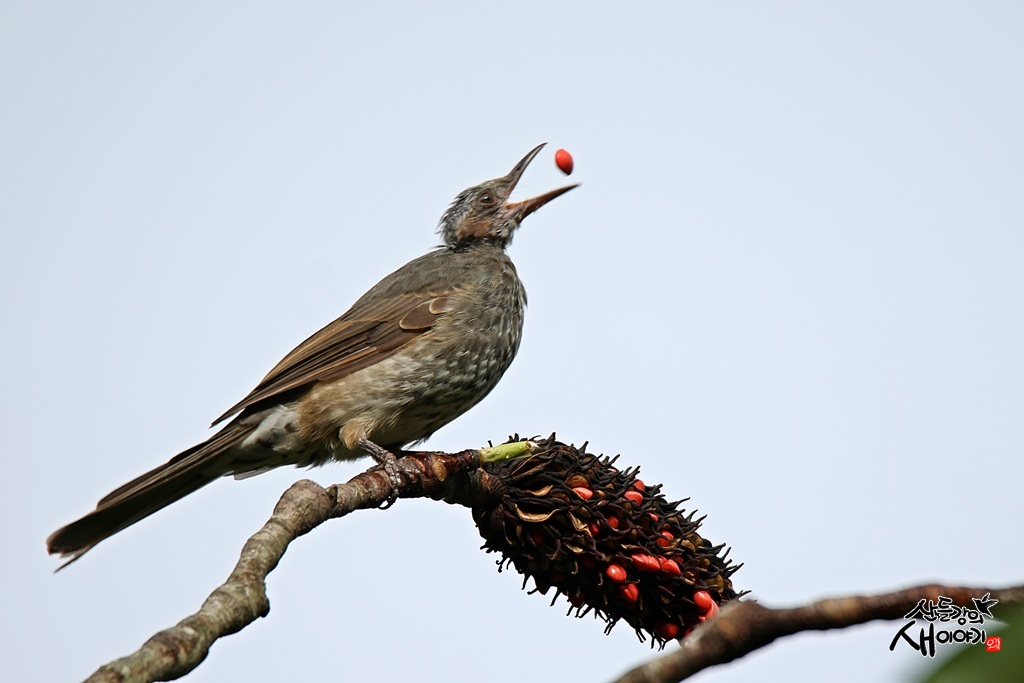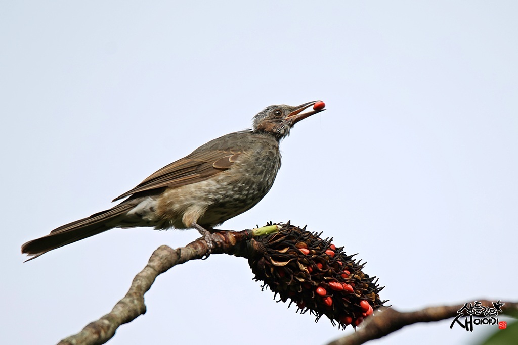 대구광역시 달서구 대곡동에 있는 대구수목원을 탐조하던 중 일본 목련의 빨간 열매를 먹는 직박구리를 관찰했습니다.