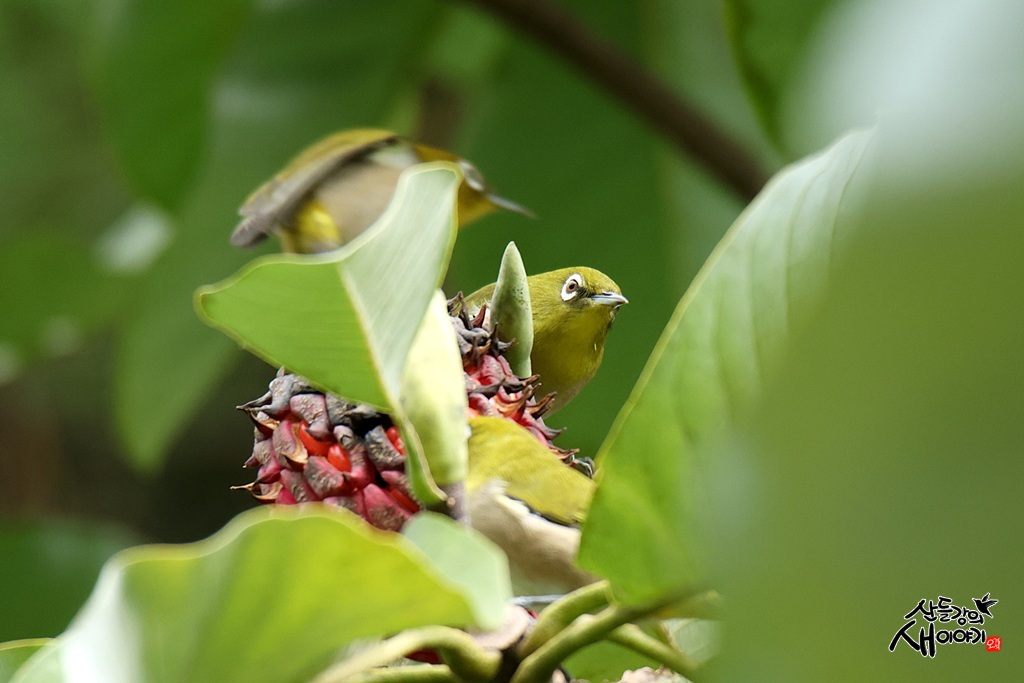 대구광역시 달서구 대곡동에 있는 대구수목원을 탐조하던 중 일본 목련의 빨간 열매를 탐하는 동박새를 만났습니다.