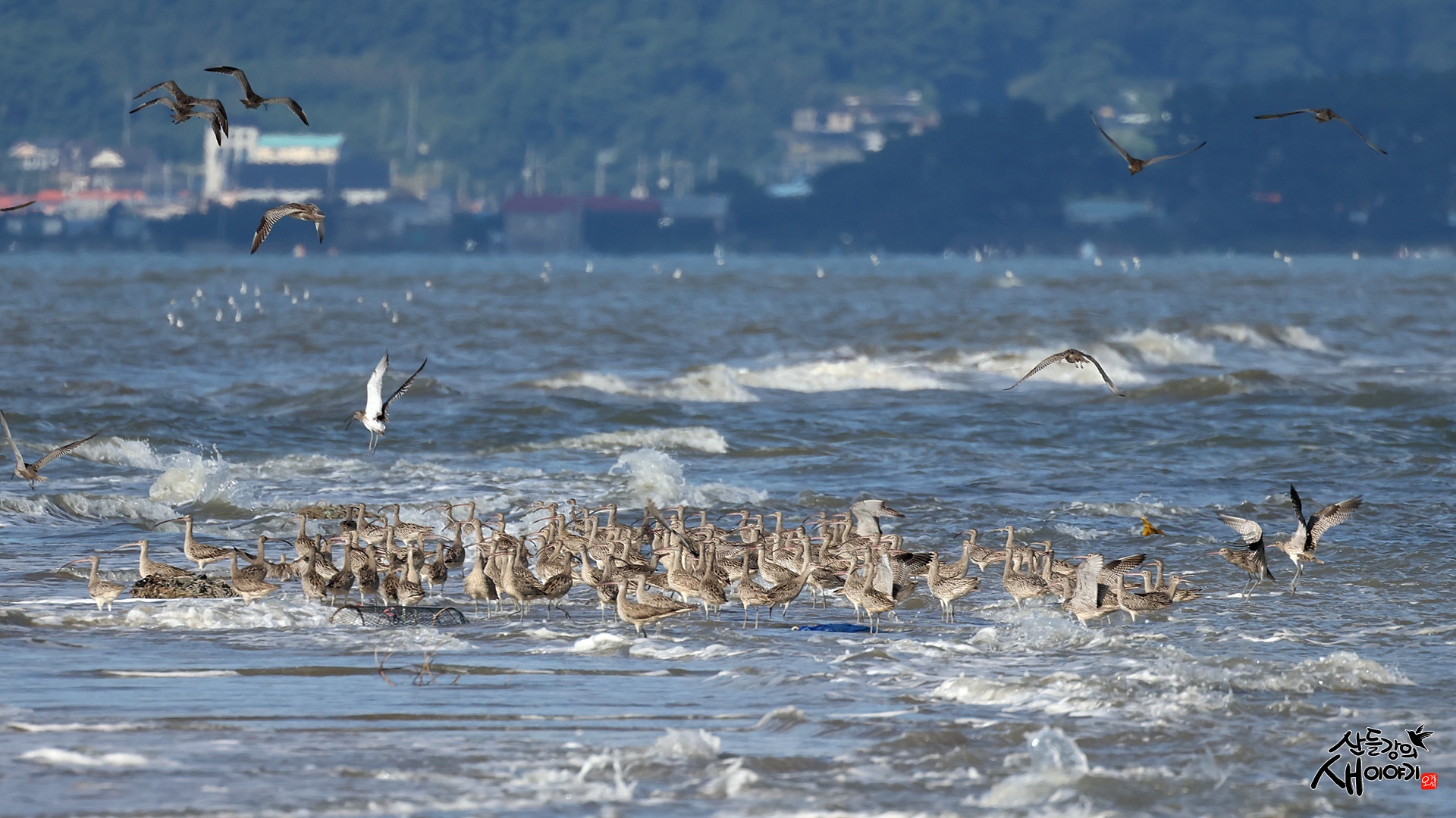 충청남도 서천군에 있는 유부도를 탐조하던 중 만조 전 마지막 남은 섬에 있는 알락꼬리마도요의 모습입니다.