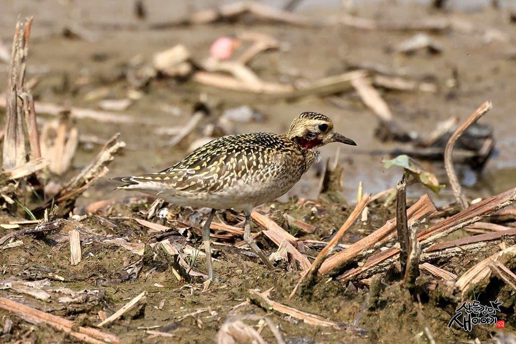 연근을 수확한 연밭을 탐조하던 중 검은가슴물떼새 무리 사이에 큰 상처가 있는 개체가 관찰되었습니다.