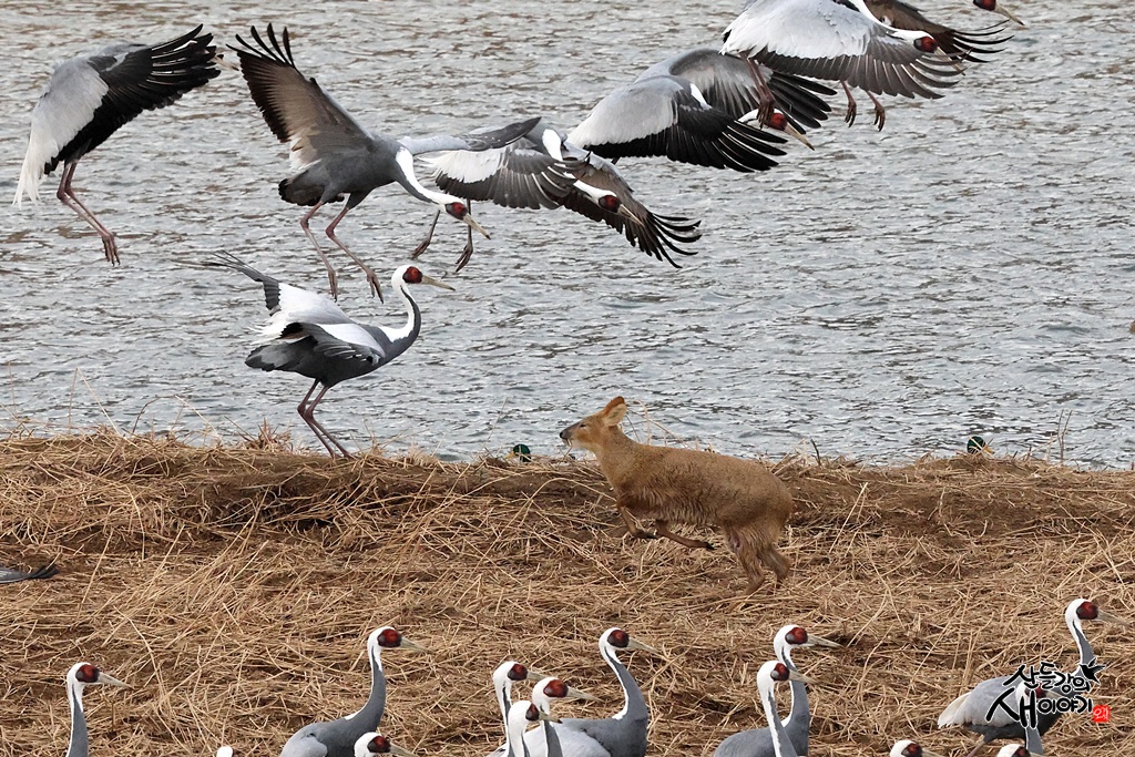 두루미 쉼터에 난입한 고라니