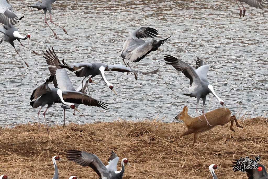 강원특별자치도 철원군에 있는 두루미 쉼터를 탐조하던 중 재두루미 무리에 난입한 고라니를 관찰하였습니다.